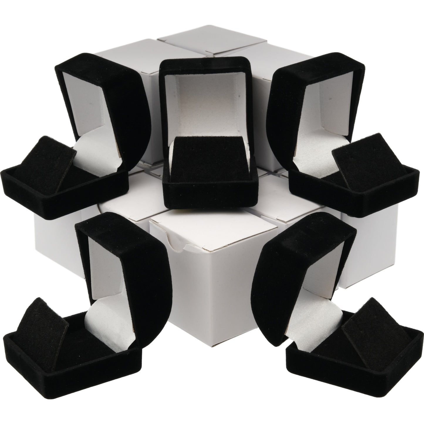 - The boxes are black and lined with white satin on the inside